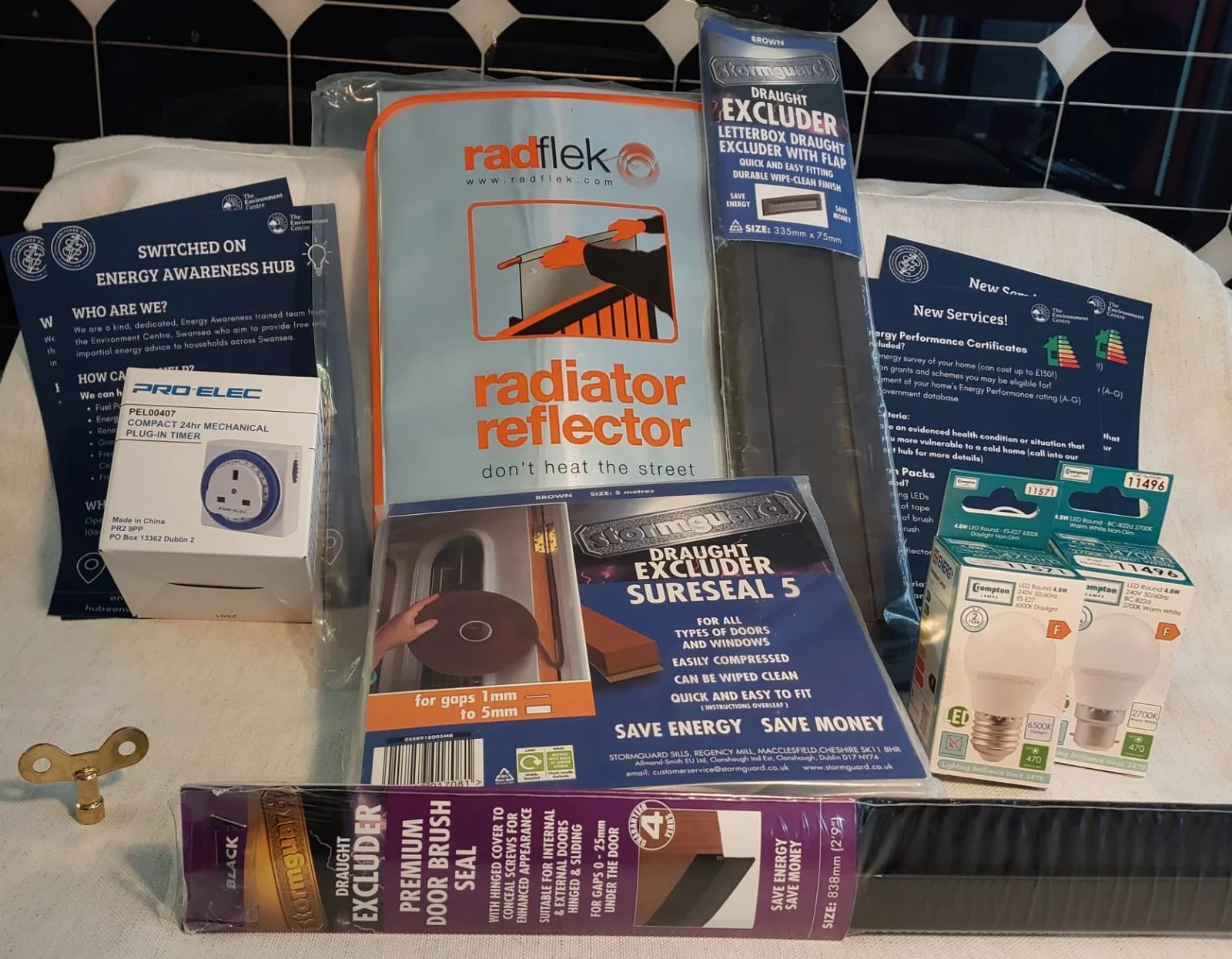 Each pack includes energy saving LEDs, radiator reflector, draughtproof tape, door brush seal, letterbox draught excluder, timer plug, and a radiator key.
